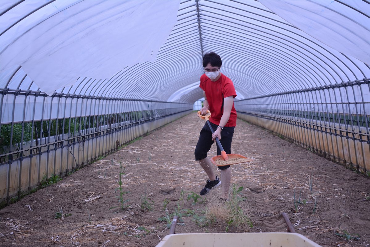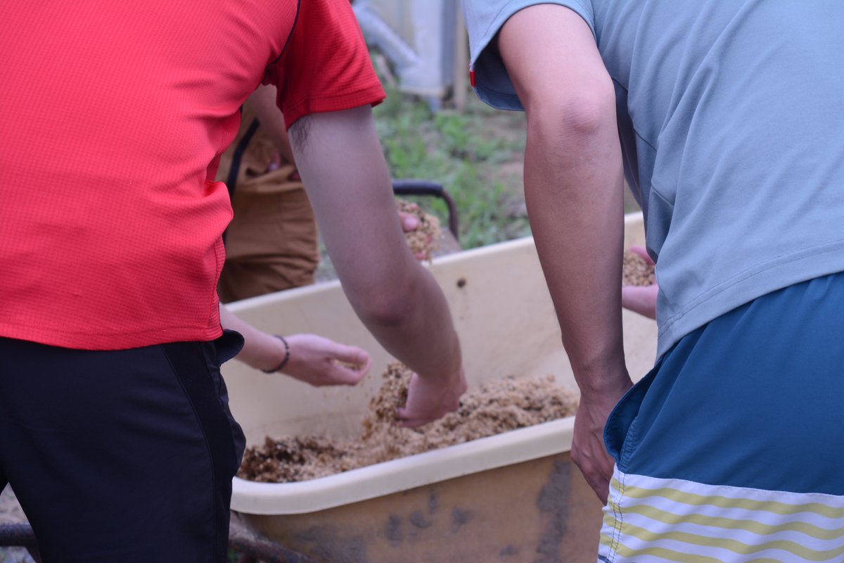 (土にもみがらを混ぜて、土に酸素が送られやすい状態を作る工程)