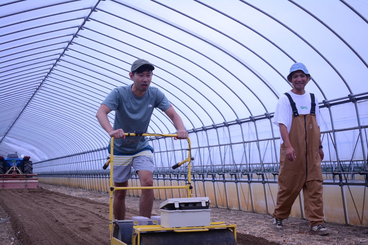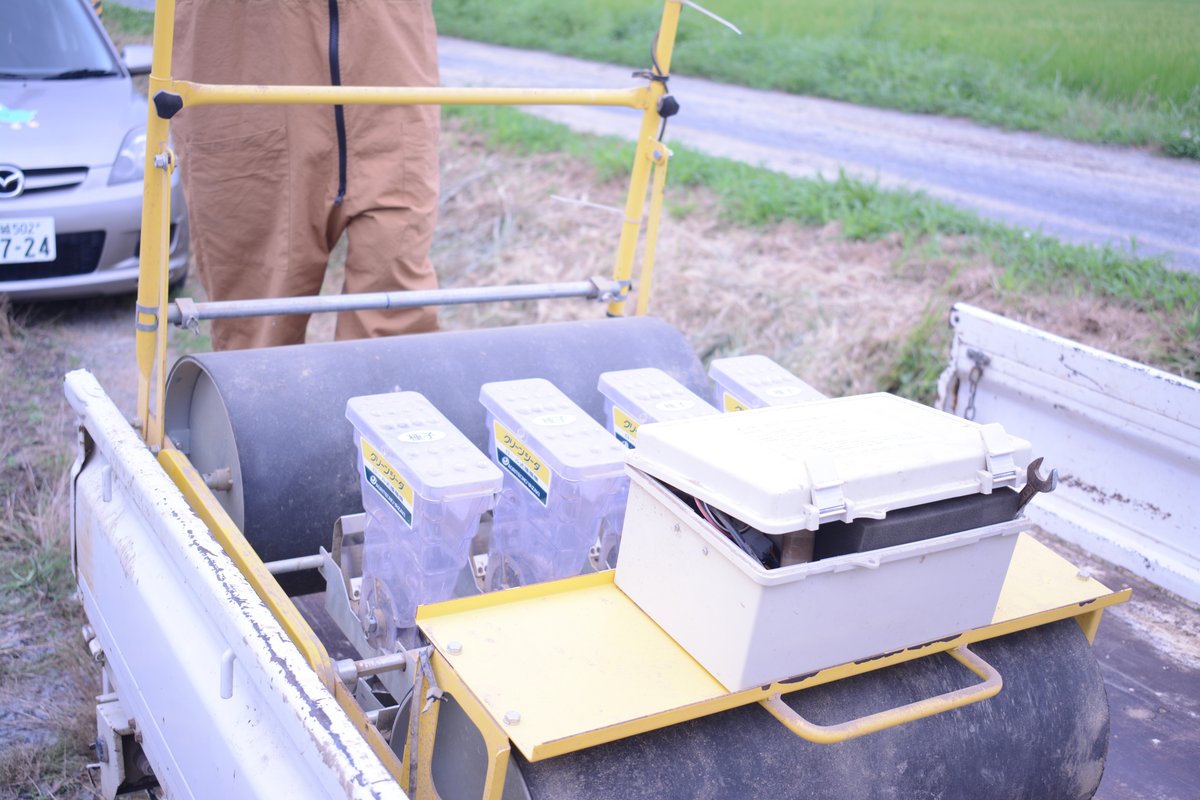 種まきも、電動の手押し車に種をセットして前に進むだけで種をまけるようにしています。