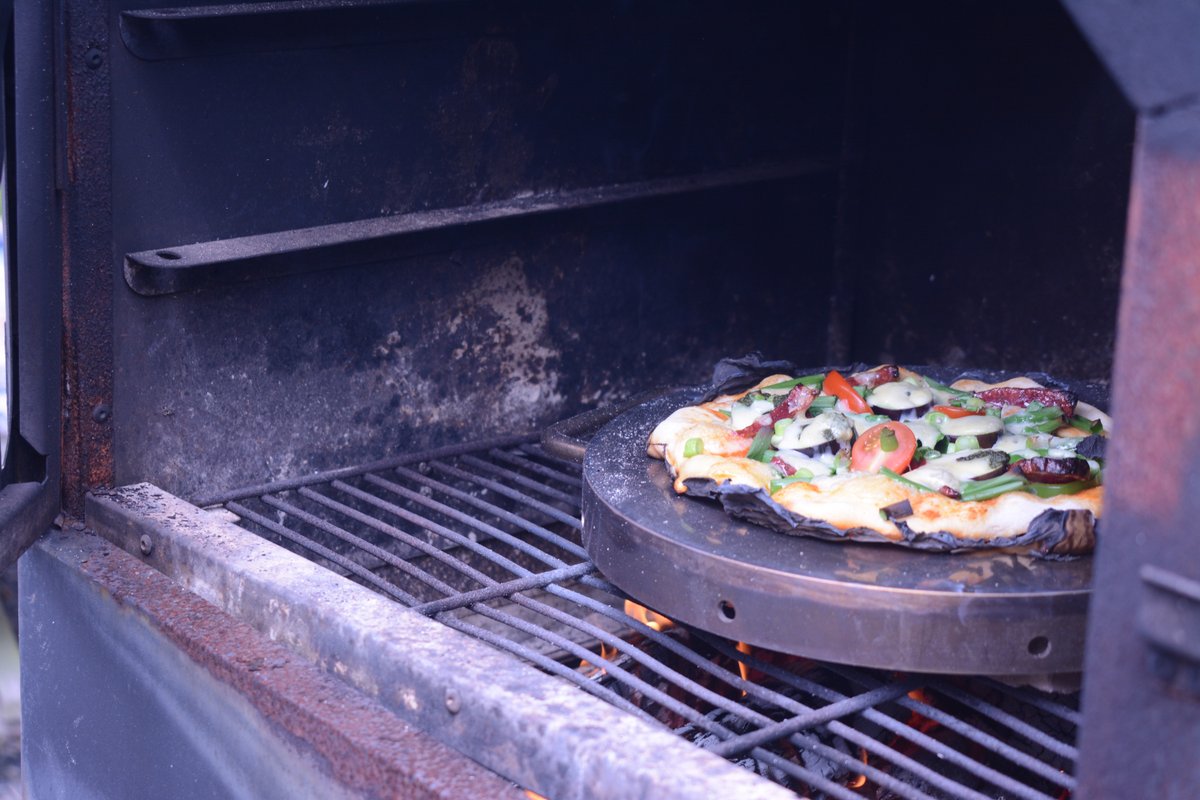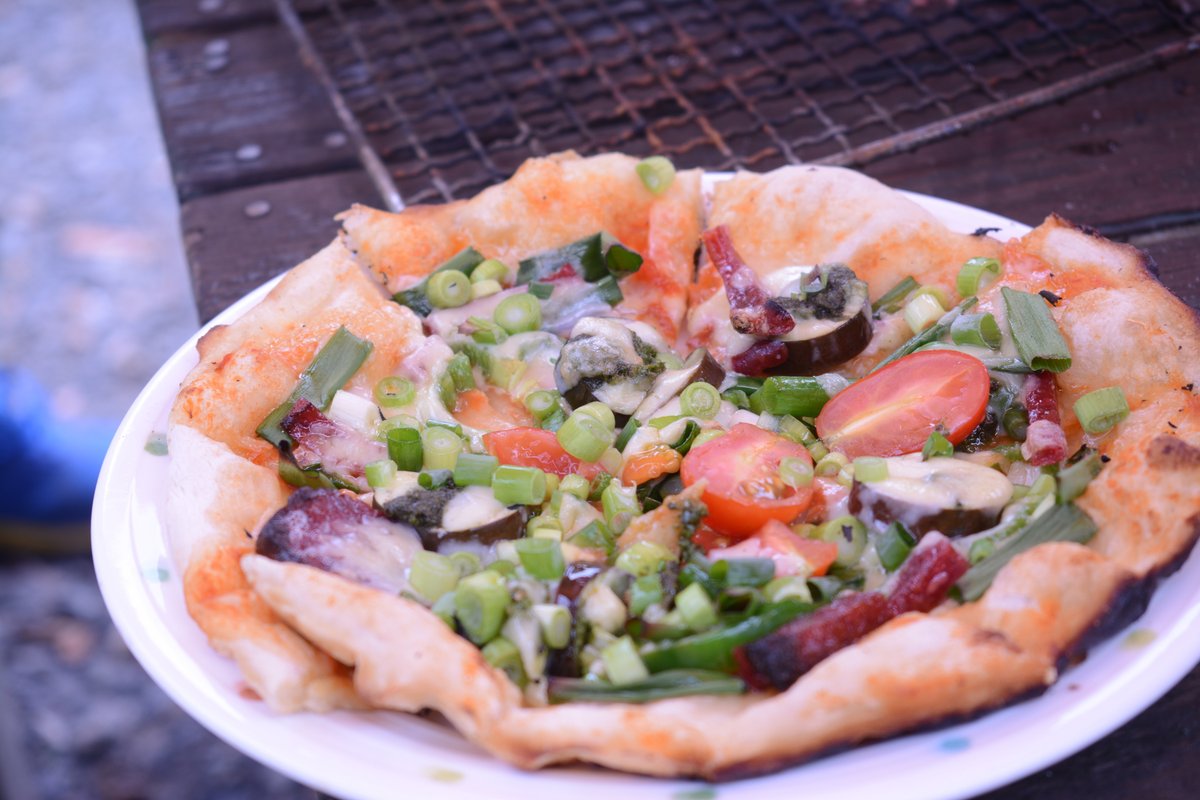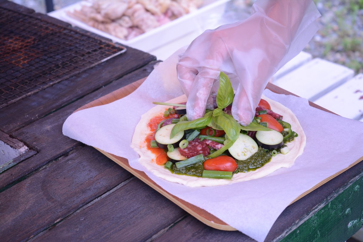 カットした野菜をソースとともに生地にトッピングし、少し前に完成したという手作りピザ窯を使って焼き上げました!
