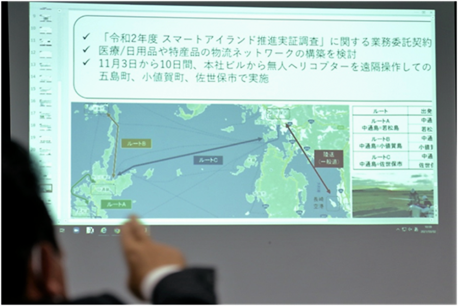 「2020年11月3日より10日間、長崎県西部の離島(新上五島町および小値賀町)および本土(佐世保市)を舞台に、国交省スマートアイランド推進実証調査を実施。こちらに関しては、ドローンと同様の無人航空機にカテゴライズされる無人ヘリを使用しました。上五島町内(中通島、若松島間)のルートA、上五島町・小値賀町間のルートB、上五島町・佐世保市間のルートCという3ルートにおいて、東京都内のJAL本社から遠隔操作で無人ヘリ輸送を行う、という実証調査です。遠隔操作の指導や無人ヘリの提供などはヤマハ発動機の全面協力、さらには新上五島町役場などの協力で実施。天候不良の影響で就航率は80%程度でしたが、その中で総飛行距離1,216km、総飛行時間28時間27分という物流調査実証を実施できました。離島と本土間、離島間、離島内の物流改革において、非常に可能性がある事業だと感じました」
