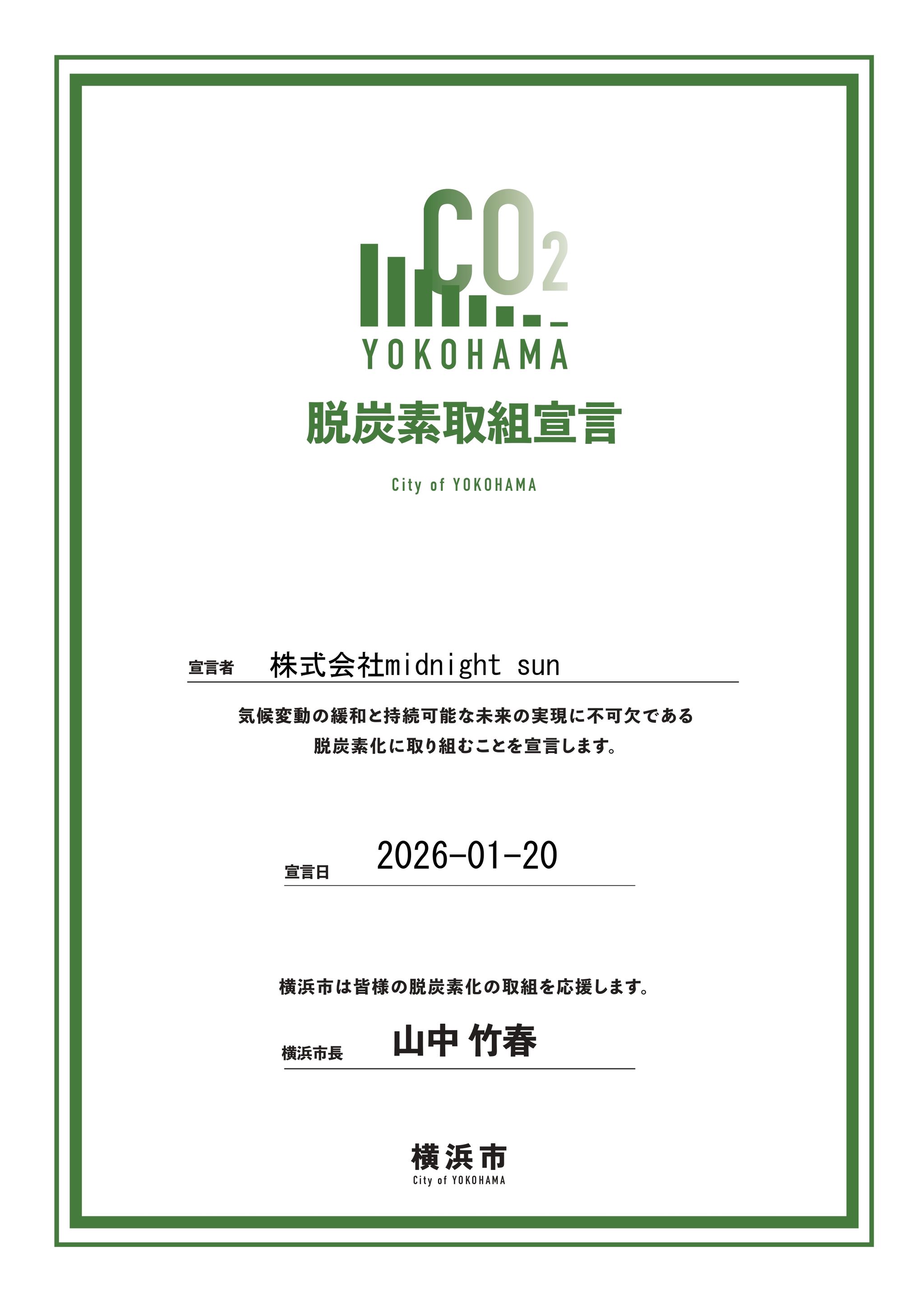 株式会社midnight sun(本社:横浜市西区)は、横浜市が制定する「脱炭素取組宣言」に本日参加しました。